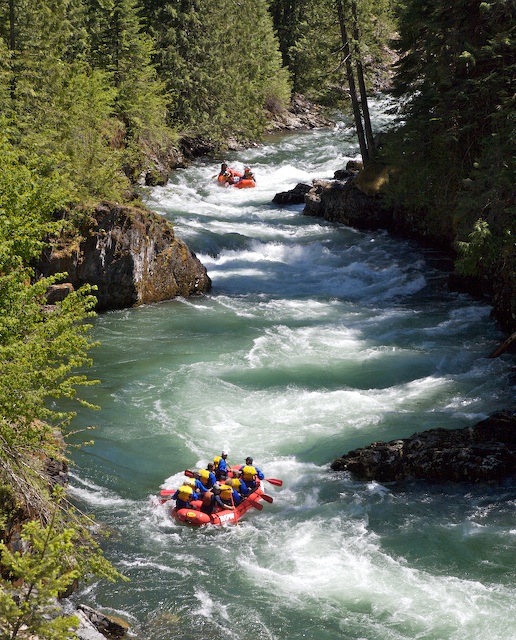 Flowing from the Purcell Mountains of Canada, the Moyie crosses the border just northeast of Bonners Ferry. It flows for about 20 miles in Idaho before hurling over Moyie Falls and running into the Kootenai River. As there are no dams on the river upstream in Canada and it comes from a fairly small watershed, the season is short. Trips typically start in late April or early May and go until mid to late June, depending on the year and how much snow fell in the mountains. It’s an exciting Class III trip that turns into Class IV at high water. The highlight of this 15-mile trip is paddling by the old Eileen Dam. Built in 1923 to power local mines, the rock that the dam was anchored to gave way a year or so after it was built. The old concrete arch is still in place in the river which now flows into a new channel where Skin Creek enters the Moyie. Most of the trip is in a roadless canyon lined with cedar, pine, and fir. ROW Adventures pioneered commercial rafting on the Moyie River in 1982 and offers trips for a few weeks each spring.