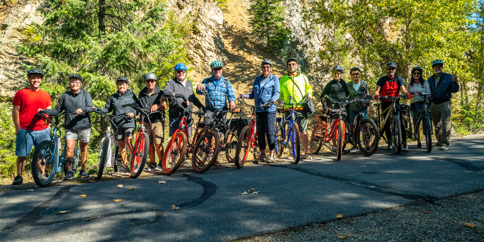 A group of ROW riders stop for a photo with their Pedego E-Bikes