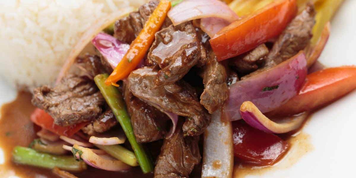 The most prominent Chinese influence in Peruvian cuisine is seen in the beef dish of lomo saltado. Strips of soy-marinated sirloin beef are stir-fried with onions, tomatoes and chilies before french fries are added to the mix and the dish is served over white rice. It originated as part of the chifa tradition (the Chinese cuisine of Peru) but has become a popular mainstream dish across the country.