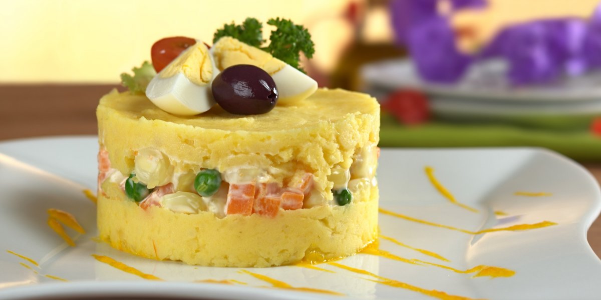 Originating as a Quechuan dish, causa is a layered potato casserole that is normally served chilled as a salad or a side. This colorful dish features mashed yellow potatoes with layers of avocado, hard-boiled eggs and often tuna or chicken, together with a delicious lime and yellow chili sauce.