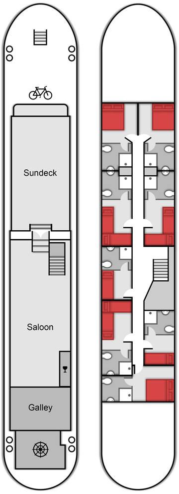 The raised sundeck is the ideal spot to enjoy your morning coffee or a sundowner while watching the centuries-old farms and lock houses pass by. If you want to cycle along the towpath and explore the charming villages along our route, you can take advantage of the bicycles and helmets that are stored just below on the front bow deck.