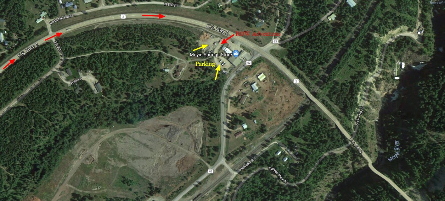 Where to Meet: Towards the end of this document, you’ll find directions for how to get to the Moyie Springs store, where we'll meet you at 9:00 AM Pacific Time the morning of the trip. Driving from Spokane you should allow about 2 1/2 hours. From Coeur d'Alene allow about 2 hours. The store is busy with regular local customers in the morning, so please arrive between 8:30-9, but not earlier. If you realize you're early, stop for a cup of coffee at the Three Mile Cafe, just 3 miles north of Bonners Ferry. Or, enjoy the scenic overlook just east of the Moyie Springs store on the other side of the bridge. The store's phone number is (208) 267-6266. When you arrive, pass through the metal gates to the right (west) of the store and park in the back. Here we'll welcome you and you'll change into the wetsuit provided by ROW. Then we'll drive in our bus about 45 minutes to the put-in, located roughly 5 miles below the Canadian border. We’ll have a safety talk here, and then board the rafts. At the end of the day, we return you to the store between 4:00 and 5:00 PM depending on group size, weather and/or water level.