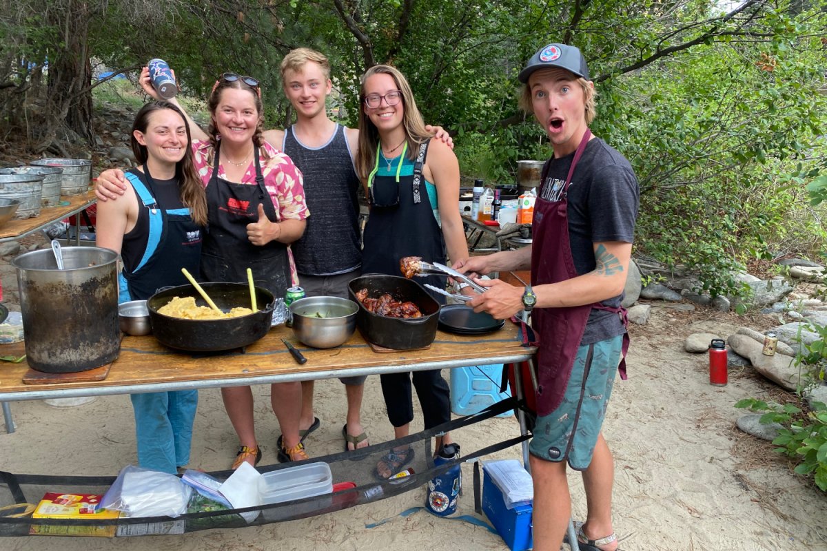 A team of ROW River Guides busy at work in our backcountry kitchen.