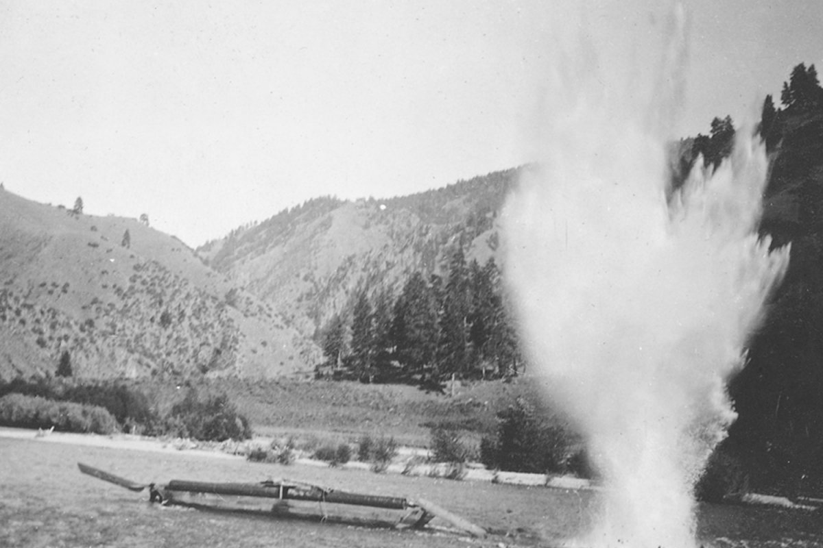 Dynamite is used on the Salmon River to blast open a channel and free the sweepboat stuck on the gravel bar