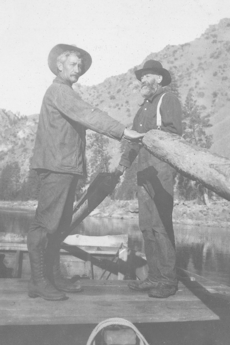 One of the earliest sweep boat pilots, and well-known character of the Salmon River was John McKay. Born in Scotland who was a skilled millwright. The story is that he had built a large mill and invited his young bride to come see it. While there her skirt was caught in the flywheel and she was killed. A broken-hearted McKay found his way to Idaho and became a placer miner and recluse. In order to reach places others couldn’t, McKay started a pattern of building a small scow that he could man himself, and each spring, depart Salmon to head downstream. He would hunt, fish and, using a rocker box, gather gold at sandbars. He sometimes spent the winter in the canyon in a small hut he’d build with lumber from his boat. He would often continue west, all the way to Lewiston, where the lumber was sold and he’d return to Salmon to start a new boat. It’s estimated he did this long journey at least 20 times during his life. My grandfather met Johnny McKay, as evidenced by the photo he took in 1913 of Johnny mining along the river.