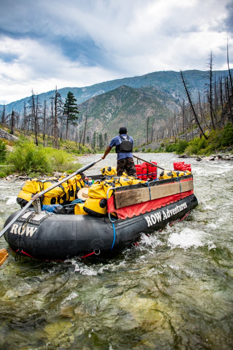 When you join a trip with ROW Adventures on the Middle Fork of the Salmon, you will see our sweep boat in action. Built by Demaree Inflatable Boats in Friendsville, Maryland, it’s a handsome black boat that we cherish. Loaded with most of the guests’ dry bags, tents, kitchen gear and much of the food and beverage for our six-day trips, piloting this boat is a big responsibility.