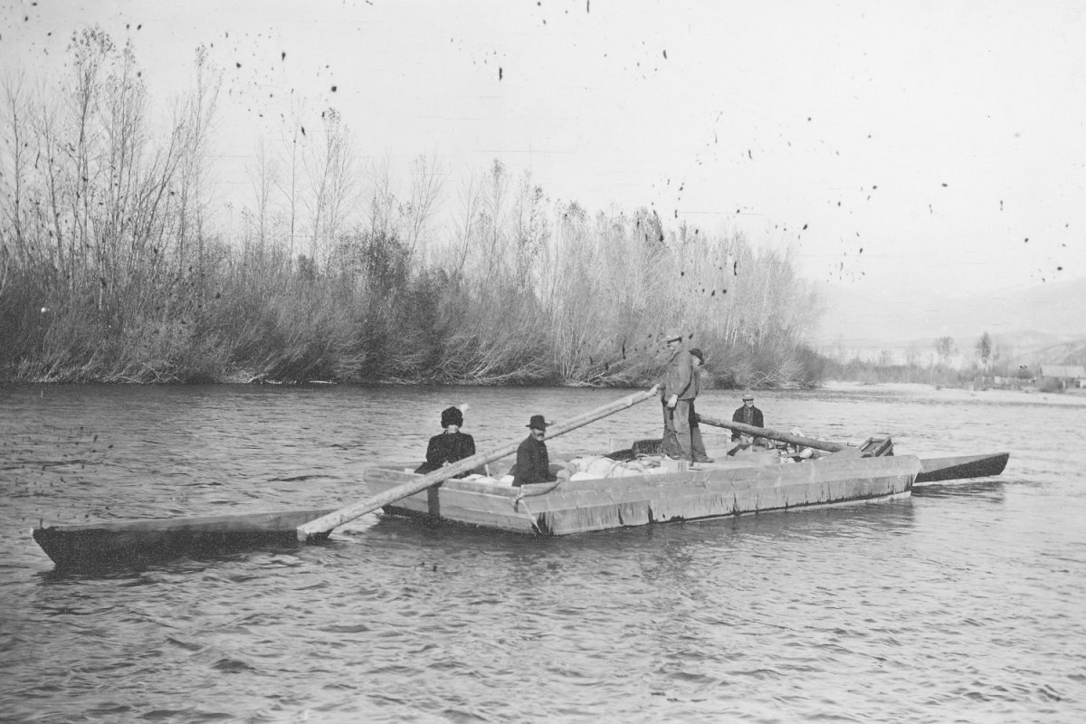 We know from the Idaho Recorder, Salmon’s newspaper of the day, of other departures from Salmon downstream. According to Cort Conley, the boats could be built in a few days and generally were 8’ wide and around 32’ long. They had a flat front and a back that sloped up and out from water level. They were built with a double hull and a raised floor to keep the cargo dry. For steering, trees were cut to make 28’ long poles, each fitted with a 12-14’ blade, or “sweep” that sat in the water. There was one in the front and one in the back. It generally took two men to run a boat of this size and the poles, or sweep arms, were quite heavy and sometimes counter-balanced with rocks at the handle end.